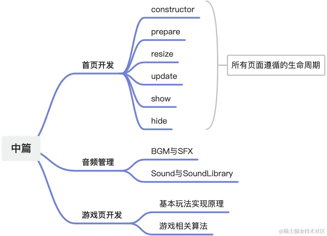 - 游戏首页的实现,其中应该着重关注每个页面所遵循的开发思路,即constructor到hide期间,各个生命周期的主要职责。