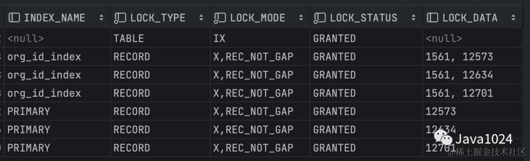 2.再走org_id索引,会给二级索引org_id=xx加上记录锁,前面加的主键记录锁不符合org_id=xx的会释放掉。
