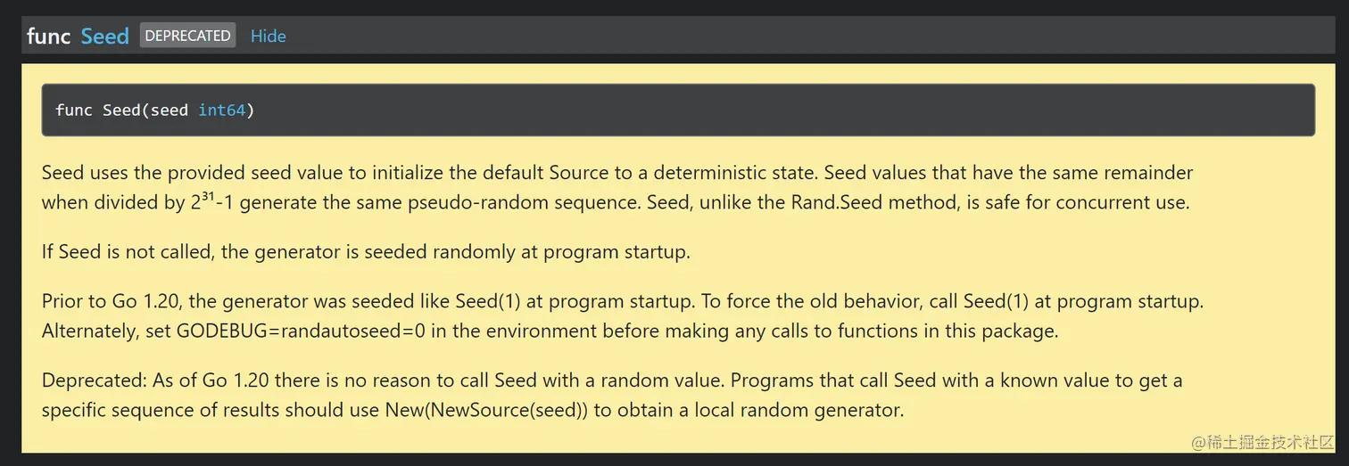 依照官方的说法,math/rand 已弃用 rand.Seed(..) 全局函数,现在自动为全局随机数生成器Int生成一个随机值,并且顶级Seed函数已被弃用。因此,每次运行程序时会生成不同的随机数。