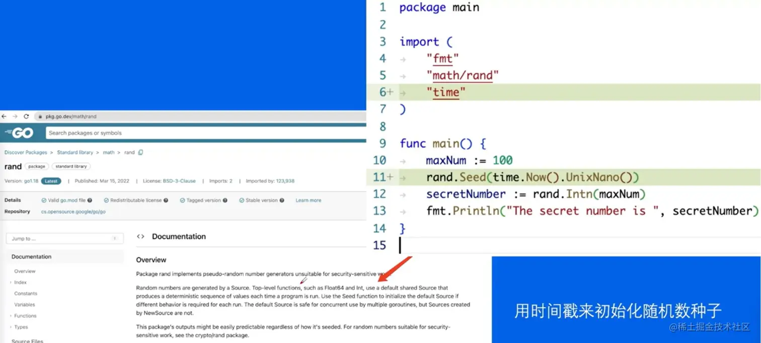 但如果在 Go 1.20 版本之前,如培训中王克纯老师演示的(Go 1.18),在调用rand.Intn()之前必须先通过 rand.Seed()设置随机数种子,这样才能让每次运行生成的随机数值不同,否则,由于随机数种子固定,每次运行生成的随机数也是固定的一个值,并不“随机”。
