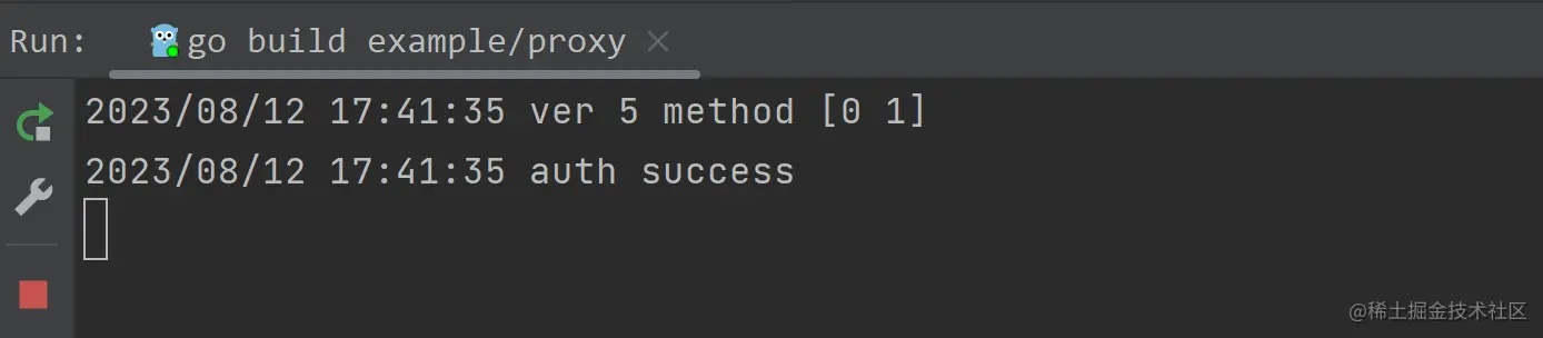 这段代码演示了一个简单的 SOCKS5 服务器,用于处理客户端的认证请求,并向客户端发送响应。现在我们用 curl 命令进行一下测试。首先还是一样,在Goland运行项目程序。然后在另一个终端执行curl命令: