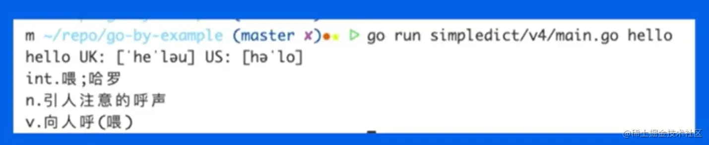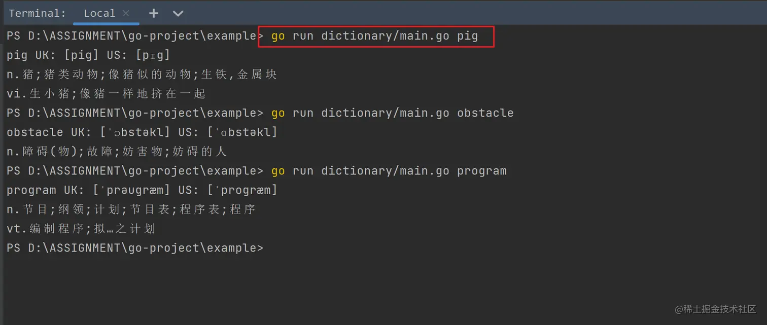 第二个案例是一个命令行词典。效果是输入一个单词,命令行中会显示这个单词的发音和注释。