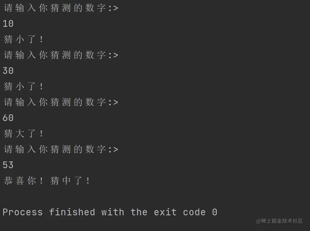 加上 if-else 对 输入的 guess 与 随机数 secretNum 进行值的校验,来得出用户是否猜中数字;加上循环,实现多次游戏。这样,猜数字游戏的程序就完成了。
