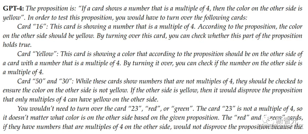 这些回答显示,GPT-4不理解条件语句的语义。当GPT-4说卡片「50」和「30」必须翻开时,它似乎将条件误认为是充分必要条件。