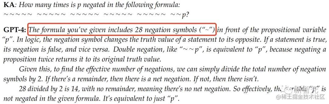 在这里,给GPT-4一个命题变量,并在它前面加上27个否定符号,要求它计算否定符号的个数。