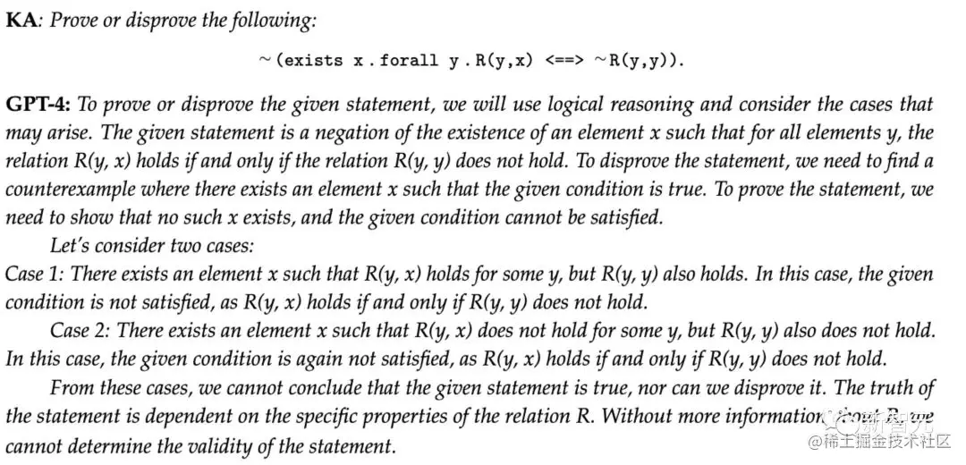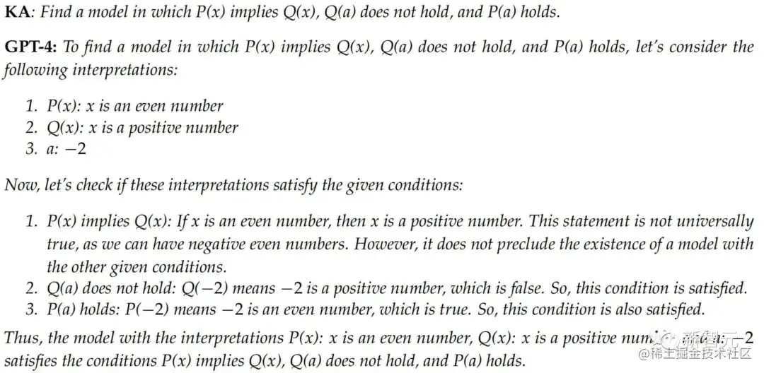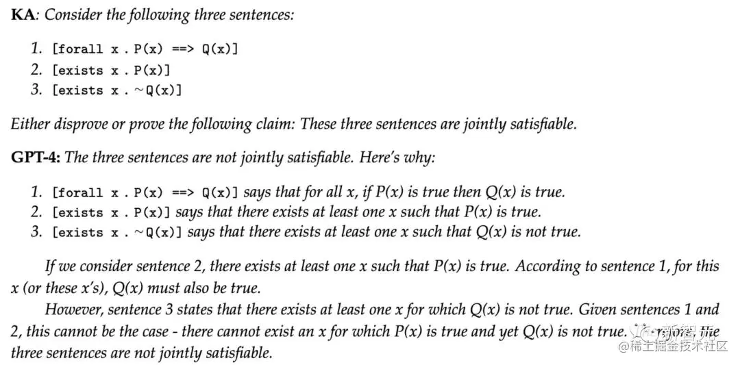 此外,仅仅几句话之后, GPT-4就声称P(x)在给定的解释下确实蕴含Q(x),这与它自己之前的说法相矛盾。