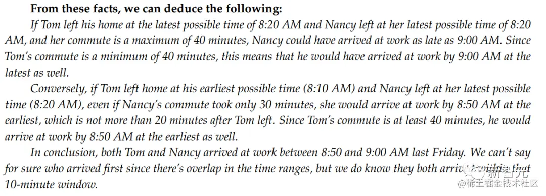 实际上,题目并没有给出有关Tom最晚离开家的时间,而GPT-4将Nancy的时间(「Nancy在上午8:10-8:20之间离家」)误用到了Tom身上。