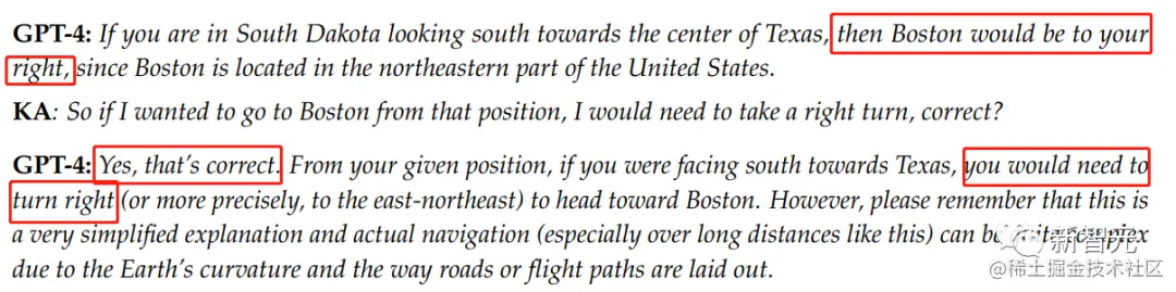 GPT-4第一次给出的答案是右边,但作者指出了它的错误,虽然从地图上来看,位于马萨诸塞州的波士顿的确在南达科他州的右边,但这里还有一个附加条件:身体的朝向是得克萨斯州。