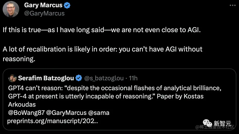 马库斯表示,「如果这是真的——正如我早就说过的那样——我们离AGI还差得远呢。我们可能需要进行大量的重新校准:没有推理就不可能有 AGI」。