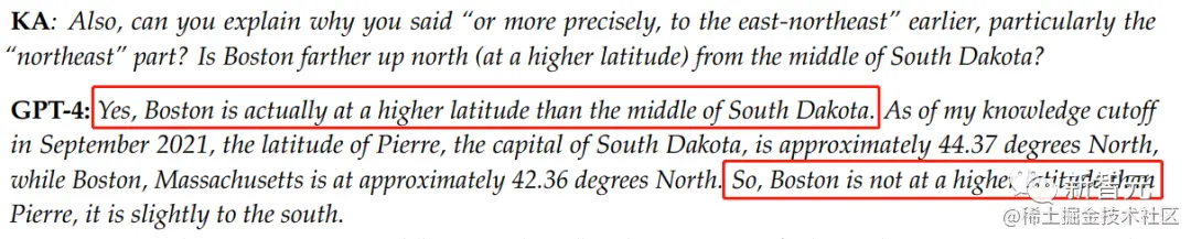 之后,GPT-4在回答波士顿与南达科他州高低位置时,出现了更严重的问题:它在同一个回答中给出了两种矛盾的描述。