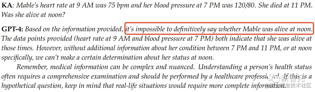 比如,当你问GPT-4:Mable上午9点的心率为75 bpm,下午7点的血压为120/80。她于晚上11点死亡。她中午还活着吗?