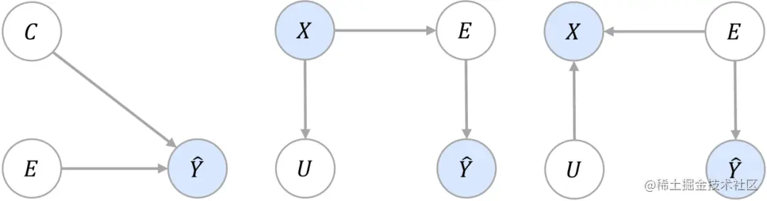 另外,他们的因果图与图 2(左)相对应。其中,对 E 的治疗(treatment)对应于对一个或一组特定特征的扰动。C 是上下文特征,表示在改变 E 后保持不变的特征。