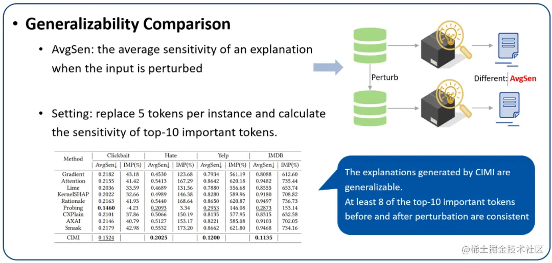 **2. 泛化性评估:**我们使用 AvgSen(平均敏感度)来评估生成解释的泛化性。不可否认,对于 AvgSen 来说,解释中包含的一些重要的 token(解释)可能会被替换,但概率很低,尤其是在分词数量较多的 Yelp 和 IMDB 中。实验结果如图 8 所示。可以看到,在四个数据集中,扰动前后的 Top-10 重要分词中至少有 8 个是一致的,这对于基线方法是难以做到的。这表明提出的方法具有捕获不变泛化特征的能力,这种泛化能力有助于避免对相似实例的重复解释的耗时成本,同时这种稳定的解释也有助于增强人们的信任。