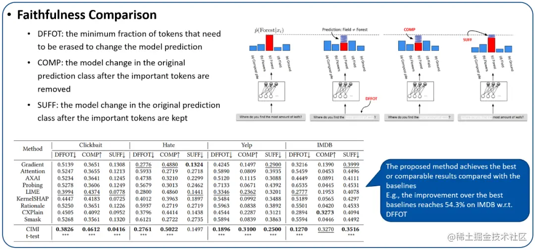 **1. 忠诚性评估:**我们使用三个忠诚度指标来评估生成解释的因果充分性,分别为 DFFOT(决策翻转的分词比例)、COMP(必要性)、SUFF(充分性)。这些指标的细节以及我们的实验结果如图 7 所示。可以看出提出的方法在各种数据集上是有竞争力的。特别地,随着数据集的复杂度越来越高(CLickbaitIMDB),相较于基线方法的提升效果更加明显。例如,在 Clickbait 上,和最好的基线方法比较,关于 DFFOT 的性能提升为 4.2%,而在 IMDB 上,相应的性能提升为 54.3%。这种良好的性质突出了我们的算法具有更好的可扩展性。