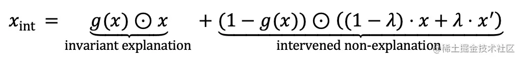 根据原则 2,我们希望 U 和 E 是独立的,这使得找到相邻实例的稳定解释成为可能,从而提高解释器的泛化能力。为此,我们基于先验知识,解释器 g 生成的解释应该对非解释的干预不变,如图 5 (中) 所示。在本文中,我们随机采样另一个样本,非解释部分进行线性插值实现干预,如下所示: