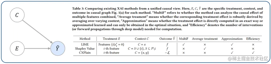图 2. 左:现有方法的因果图,其中解释 E 和上下文 C 都是影响模型预测 的因素;右:从统一的因果视角对现有可解释方法的比较。