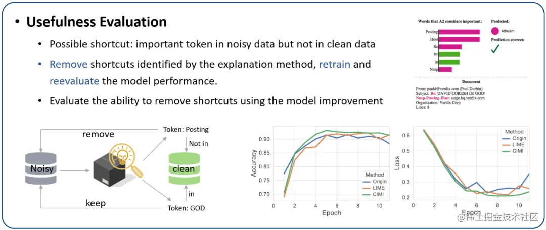 **4. 可用性评估:**解释除了让我们更好地理解模型,还有帮助调试模型。有噪声的数据收集可能会导致模型在训练过程中学习到错误的相关性。为此,本节分析了各种解释方法在删除捷径特征(shortcut)的能力。我们使用 20 newsgroups 的一个子集分类 “基督教” 和 “无神论”。选择该数据集的原因是训练集中有很多捷径特征,但测试集是干净的。例如,在训练集中出现单词 “posting” 的实例中,99% 的实例都属于 “无神论” 的类别。