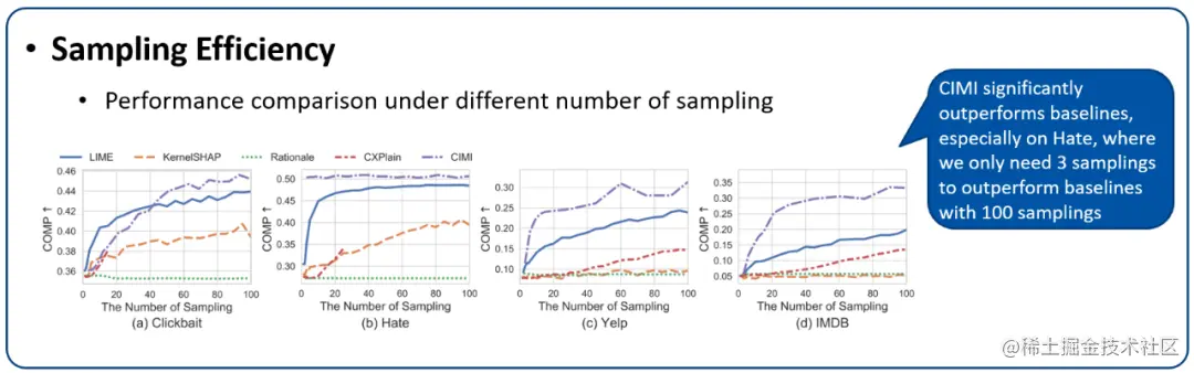 **3. 采样效率(即解释速度)评估:**图 9 展示了在相同采样次数(模型前向传播次数)下,各种基于扰动方法的性能比较。首先,CXPlain 的单特征扰动的解释机制使每个样本 x 的扰动次数最多为 |x| 次,因此在小数据集上表现出了较高的效率。其次,所提出方法在四个数据集中都显示出显著的竞争力,特别是在 Hate 上,只需要 3 个采样次数就可以超过具有 100 个采样次数的基线。这得益于神经网络在因果原则约束下的泛化能力,从大量的数据点中总结出推广到不同的实例的解释,最终提高效率。在大模型高速发展的时代,由于模型越来越大,要解释的数据点也越来越多,这种高效的采样对于解释方法显得越来越重要。