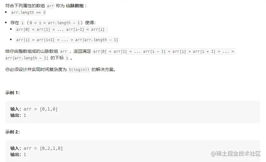 - mid 就是在山峰位置上,就是在最大位置处,大于左侧和右侧的值,arr[mid] > arr[mid - 1] && arr[mid] > arr[mid + 1]