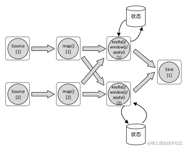 如下图,Source、map()、keyBy()/window()/apply()算子的并行度为2,Sink算子的并行度为1。keyBy()/window()/apply()算子是有状态的,并且map()与keyBy()/window()/apply()算子之间通过网络进行数据分发。