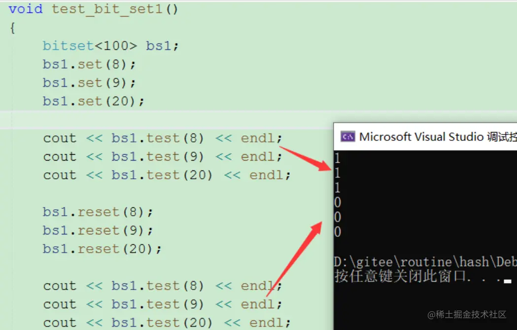 对于上图来说,有一个整形数组,我们可以使用直接定址法对数组的数据进行映射,但是与之前不同的是,此时只是使用一个比特位来代表一个整形数据,当这个数存在时,比特位置1,不存在时,比特位置0,此时就可以大大节省空间资源,无符号整数只有2的32次方个,所以最多开2的32次方个空间,一个空间为一个比特,所以最终只需要512MB的空间。但是我们不能按照位来空间,最少必须一个字节,所以我们就每次开一个字节的空间,也就是8个比特位,将8位当做一个整体来处理,对要保存的数据除8就是第几个字节,对保存的数据模8就是在这个字节中的第几个位置。