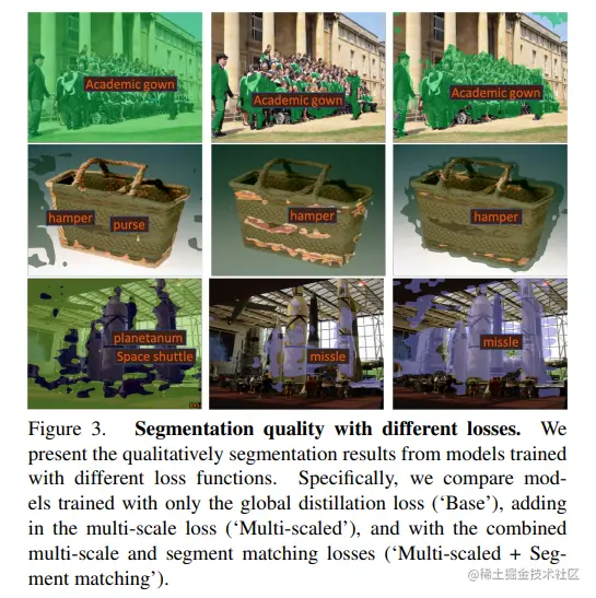 分割头部: 分割头部的输出被转化为 segment token,用于通过蒸馏进行语义分割的学习。具体来说,ZeroSeg 从预训练的 CLIP 视觉编码器中提取多尺度图像特征,并将它们蒸馏到这些 st 中。这里主要使用两种蒸馏方法:多尺度特征蒸馏损失和分割匹配损失。