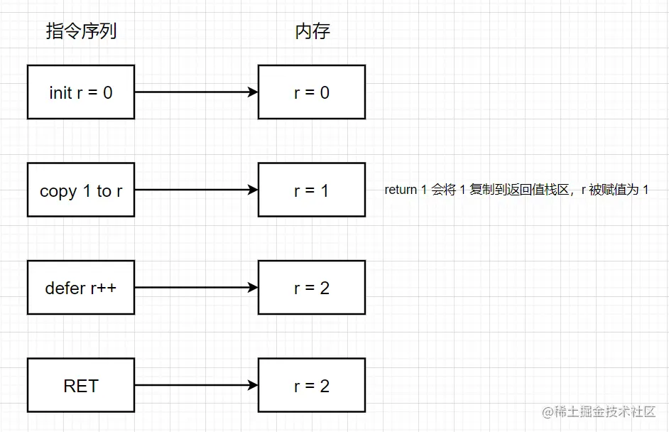 - return 1 会将 1 复制到返回值栈区,r被赋值为 1。