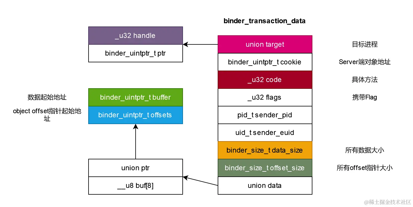 没了这两个字段,我们该怎么区分每一个Binder对象呢?答案就是上面的handle字段,这个字段会传递到对端,对端到时候也会使用此字段来获取相应的Binder实体,这一点我们在后面也会提到。