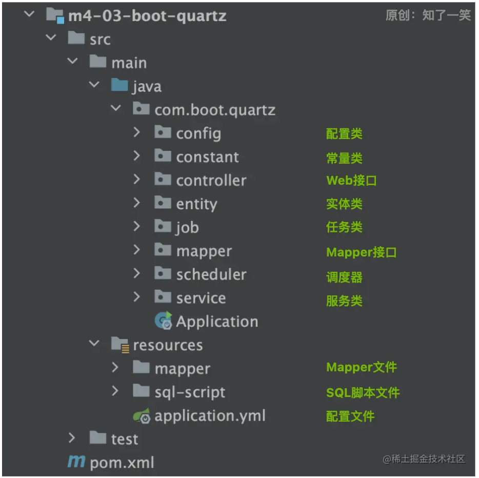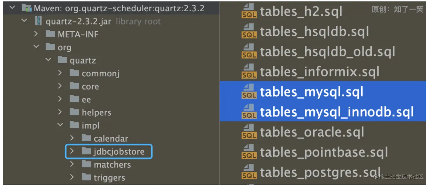 Quartz框架使用的表结构在如图的路径下,本文选择MySQL数据库存储,除此之外自定义两张表:quartz_job任务表和quartz_log任务执行日志表;