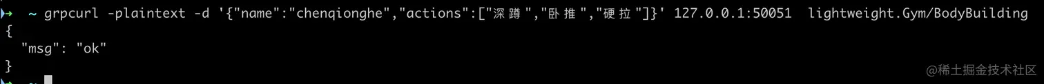 grpcurl -plaintext -d '{"name":"chenqionghe","actions":["深蹲","卧推","硬拉"]}' 127.0.0.1:50051 lightweight.Gym/BodyBuilding