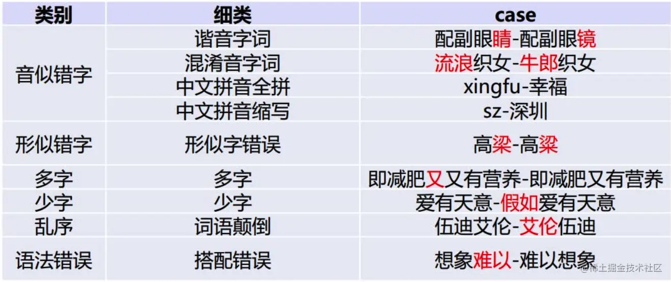 当然,针对不同业务场景,这些问题并不一定全部存在,比如拼音输入法、语音识别校对关注音似错误;五笔输入法、OCR校对关注形似错误, 搜索引擎query纠错关注所有错误类型。