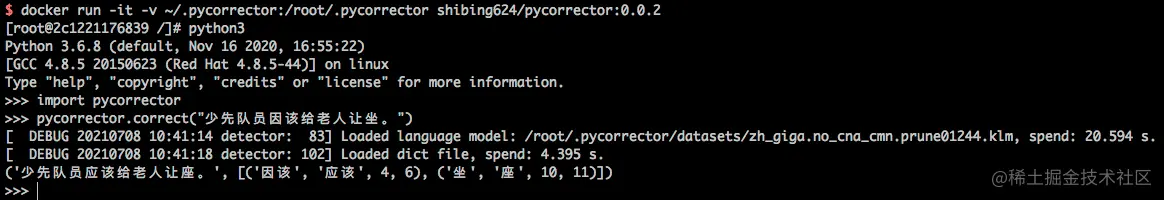 docker run -it -v ~/.pycorrector:/root/.pycorrector shibing624/pycorrector:0.0.2
