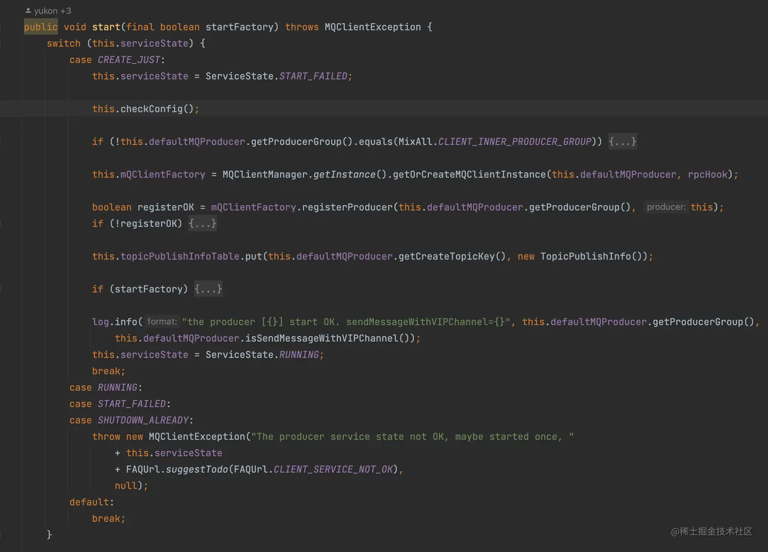对于producer启动来说,需要关心的状态就只有 CREATE_JUST,这也是 Producer 实例化之后默认的状态,在初始化时就会设置一个默认值,如下所示: