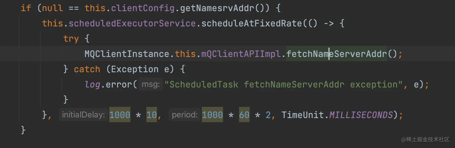 //如果当前客户端没有指定setNamesrvAddr,启动查找NamesrvAddr地址服务,每两分钟一次