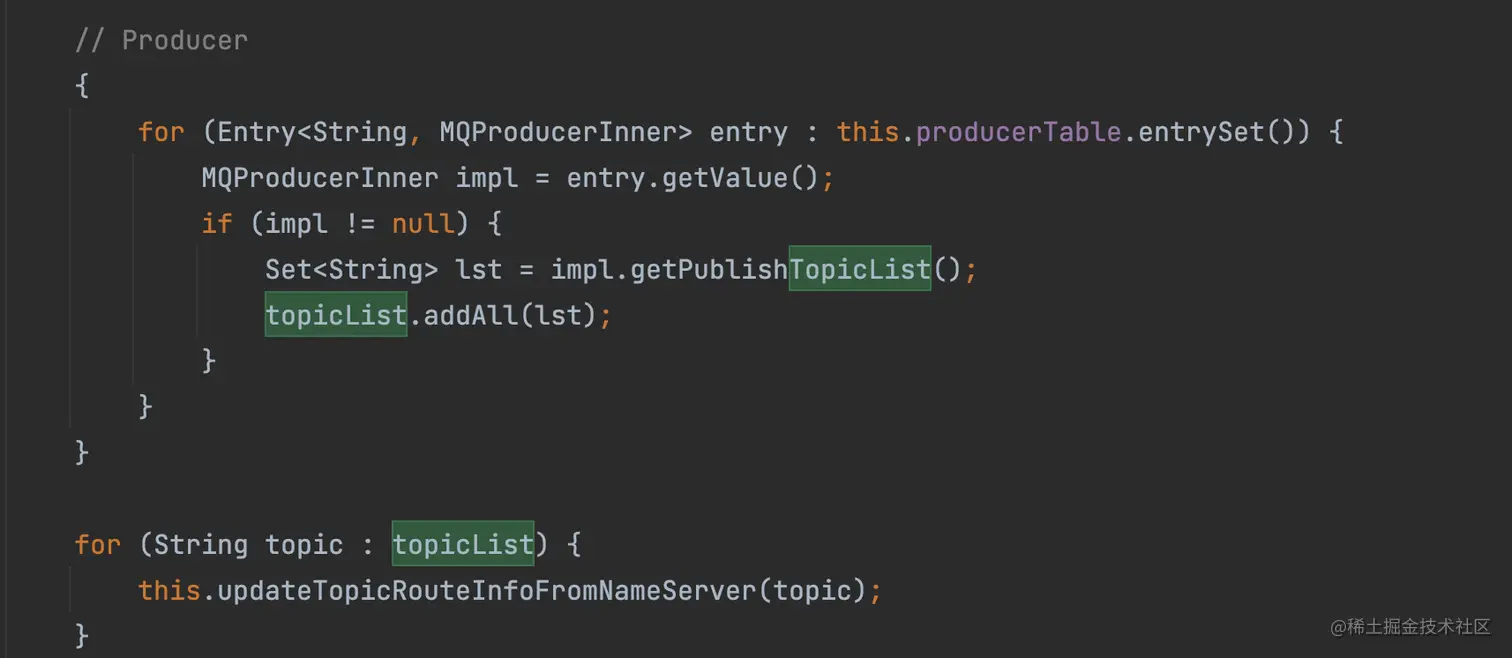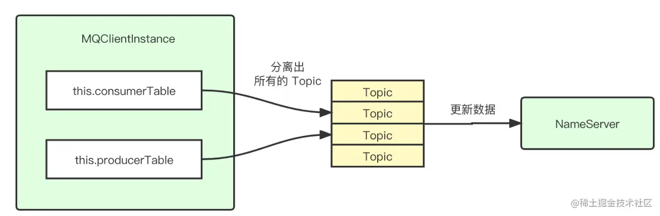org.apache.rocketmq.client.impl.factory.MQClientInstance#updateTopicRouteInfoFromNameServer(java.lang.String, boolean, org.apache.rocketmq.client.producer.DefaultMQProducer)| | 作用:减少消息发送失败的概率 | 向所有broker发送心跳 |两层含义:一来告诉 Broker 我还活着,二来定时刷新 Broker 存的客户端数据。发送心跳的可以是 Producer,也可以是 Consumer,具体看谁在使用 MQClientInstance。- 如果是 Producer,那么心跳所包含的数据很少,就只有当前客户端的所有生产者组。