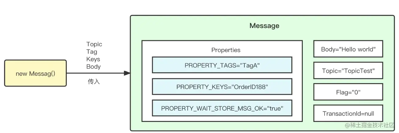 基础属性包括,消息所属主题 topic ,消息 Flag(RocketMQ 不做处理)、扩展属性、消息体 、事务ID。