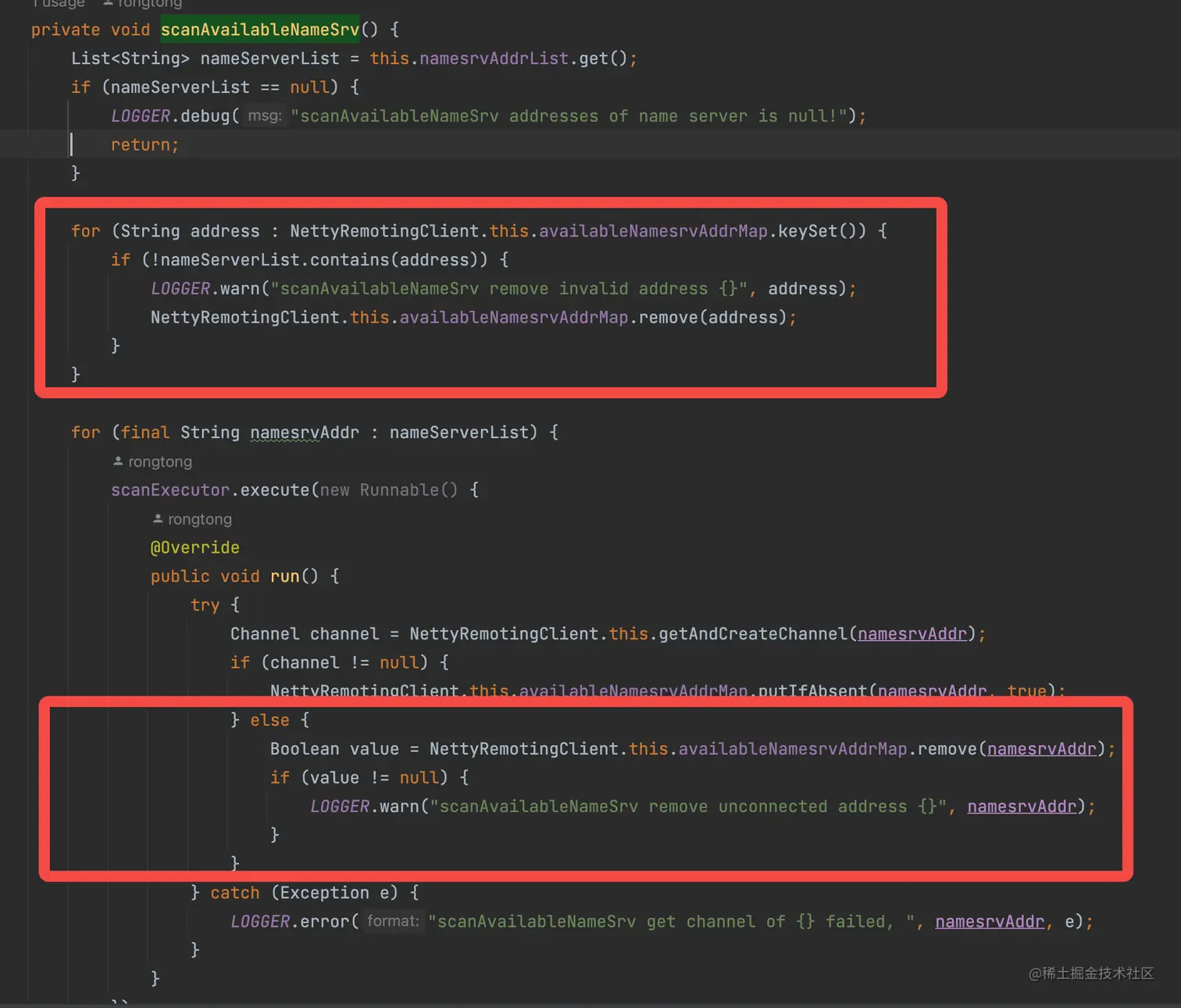 | 作用:减少消息发送失败的概率 | 扫描可用的nameserver | org.apache.rocketmq.remoting.netty.NettyRemotingClient#scanAvailableNameSrv。频率需配置这个任务是在启动Netty的时候注册的 |