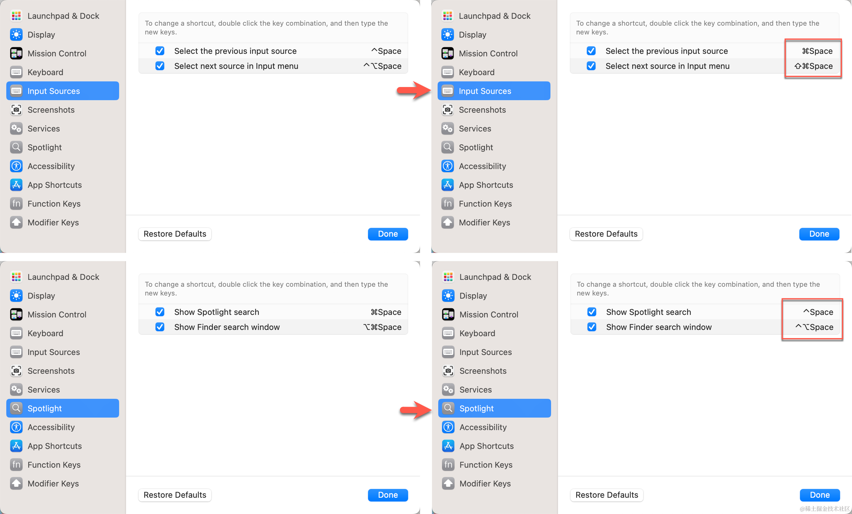| 唤起 Spotlight | Spotlight | ⌘␣ | ⌃␣ | 个人习惯 |
