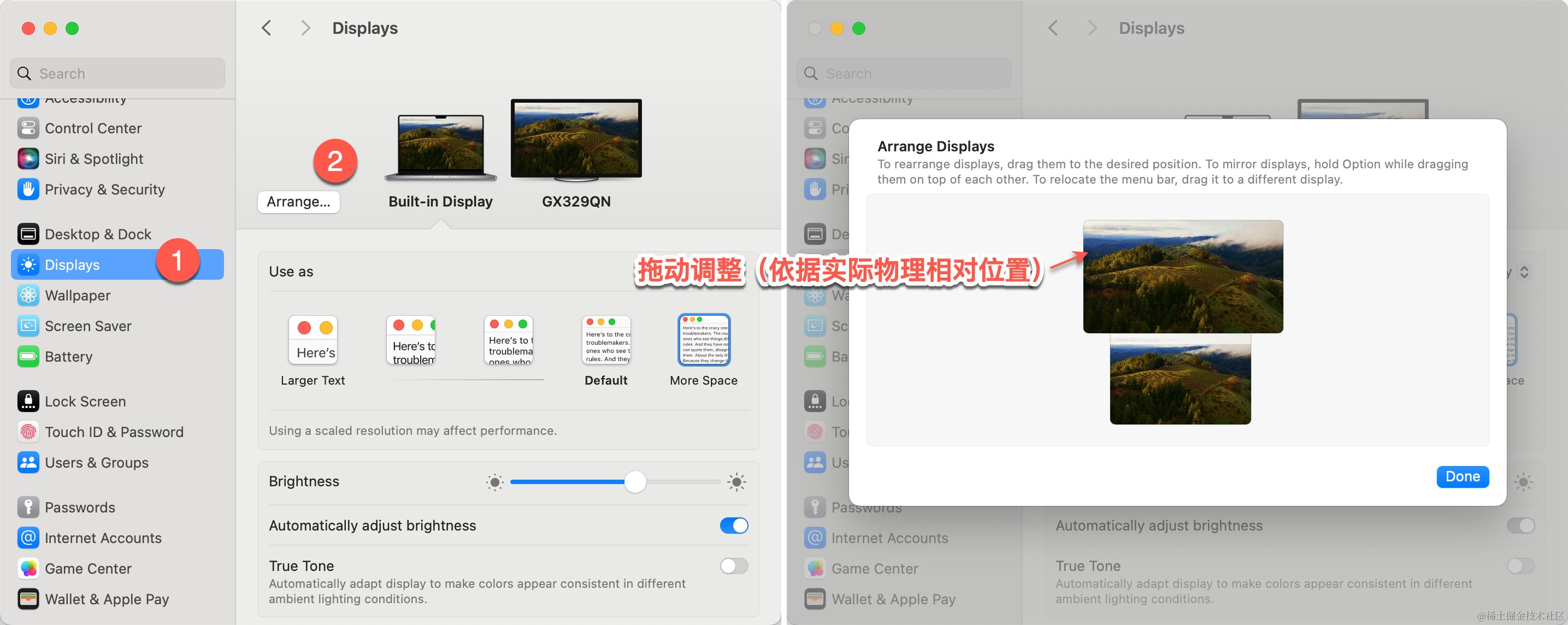 通过 System Settings → Displays 进行设置,从「Default」改为「More space」: