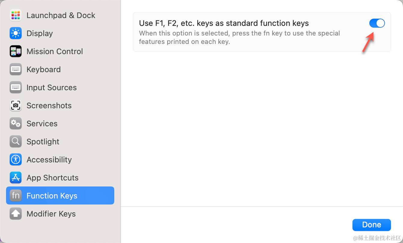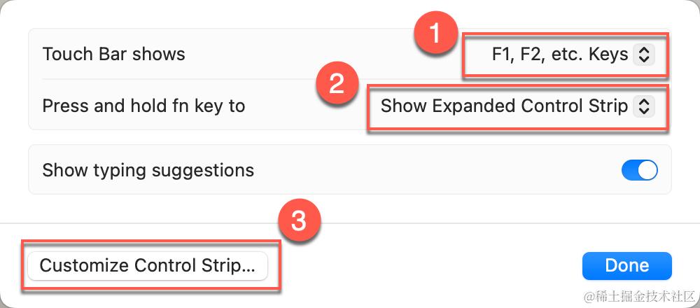 - 「Touch Bar shows」改成「F1, F2, etc. Keys」