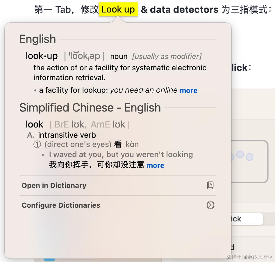 - 将 Look up & data detectors 改为三指轻触模式「Tap with Three Fingers」