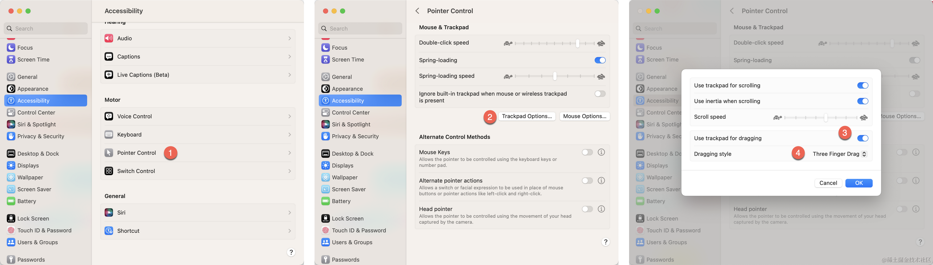 这是一个非常重要且必要,但又很诡异的设置,因为它没有放在 Trackpad 设置面板下,隐藏得很深,以至于你拖拽窗口、复制文本的时候,恨不得接一个鼠标。