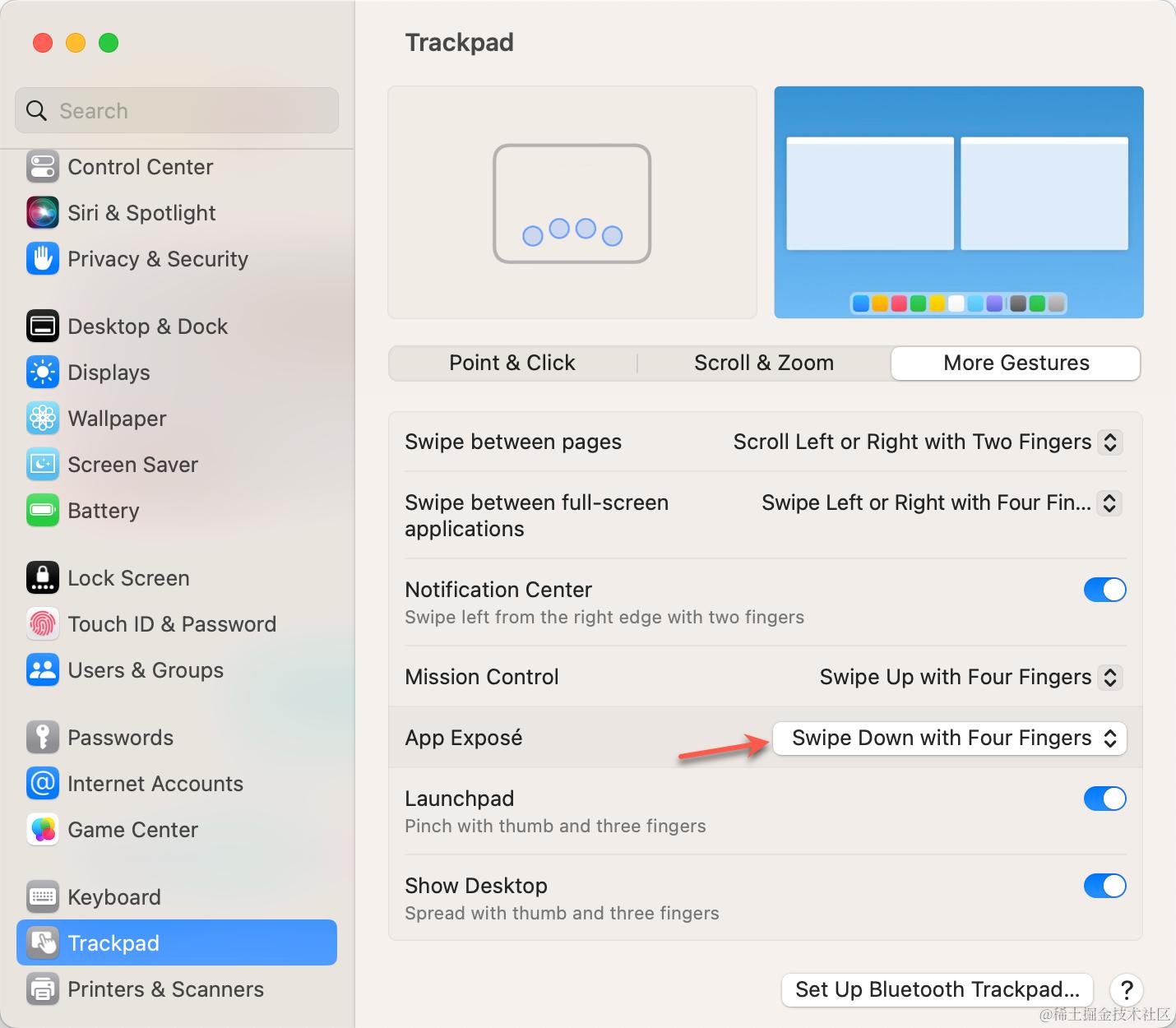 - 开启 App Exposé,从「Off」改为「Swipe Down with Four Fingers」,四指下扫