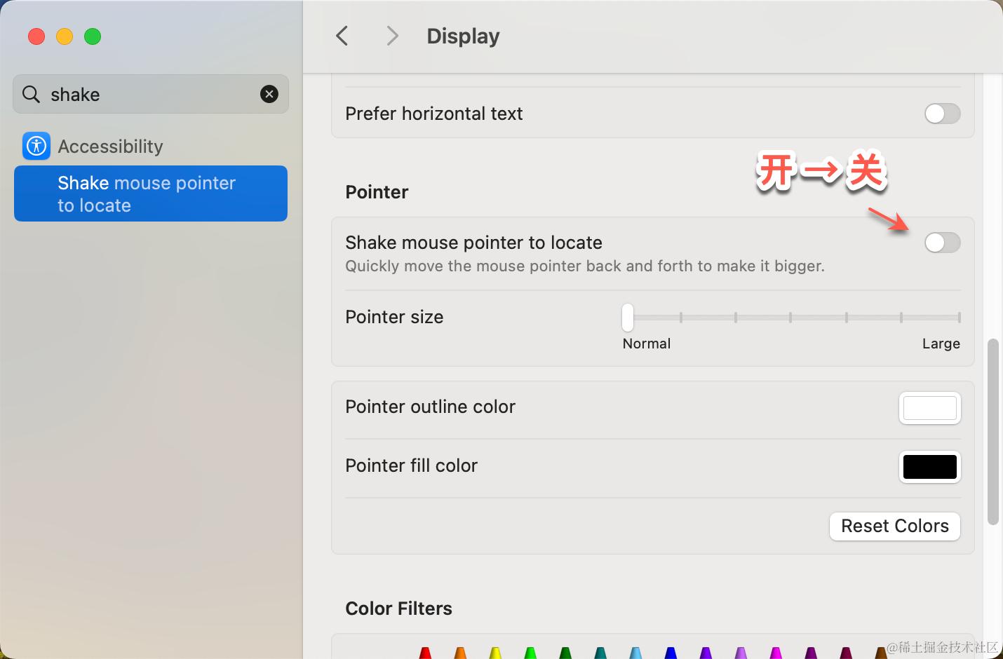在 System Settings → Accessibility → Display → Pointer 下设置,关键字「Shake」,关掉即可: