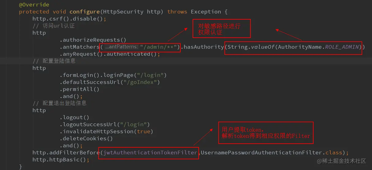 @EnableWebSecurity public class MultiHttpSecurityConfig { @Configuration public static class FormLoginWebSecurityConfigurerAdapter extends WebSecurityConfigurerAdapter { @Autowired private JwtAuthenticationTokenFilter jwtAuthenticationTokenFilter; // 静态资源访问的 url private String[] staticFileUrl = {}; // 不用认证就可访问的 url private String[] permitUrl = {}; @Override public void configure(WebSecurity web) throws Exception { web.ignoring().antMatchers(staticFileUrl); web.ignoring().antMatchers(permitUrl); } @Override protected void configure(HttpSecurity http) throws Exception { http.csrf().disable(); // 访问url认证 http .authorizeRequests() .antMatchers("/admin/**").hasAuthority(String.valueOf(AuthorityName.ROLE_ADMIN)) .anyRequest().authenticated(); // 配置登陆信息 http .formLogin().loginPage("/login") .defaultSuccessUrl("/goIndex") .permitAll() .and(); // 配置退出登陆信息 http .logout() .logoutSuccessUrl("/login") .invalidateHttpSession(true) .deleteCookies() .and(); http.addFilterBefore(jwtAuthenticationTokenFilter,UsernamePasswordAuthenticationFilter.class); http.httpBasic(); } } }- 提供一个jwt认证服务:提供 jwt token 的 生成和更新 功能 (其实就是一个controller)
