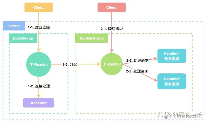Netty基于Reactor模型实现,Reactor模型主要由Acceptor、Reactor、Handler组成。