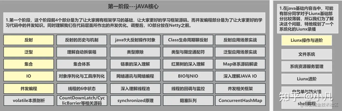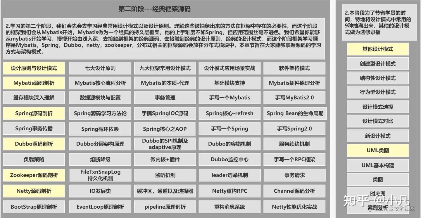 这个阶段的前4个部分旨在帮助大家建立框架学习基础,学习框架源码。并发编程这部分的目的是帮助大家更好地理解并发在代码中的应用,以及在代码层面进行并发优化。
