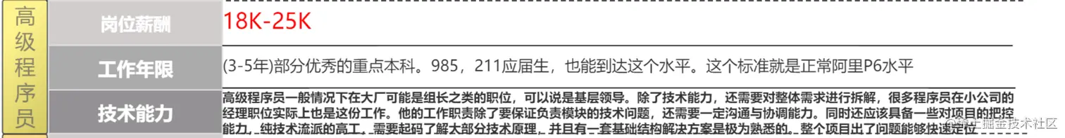 上述能力模型是基于大部分程序员基础现状综合现状进行整合,个别数据可能会有不精准,同时标准基于大部分互联网大厂技能模型进行设定,小公司请参考薪资范围定级。(级别会骗人,薪资不会骗人)。