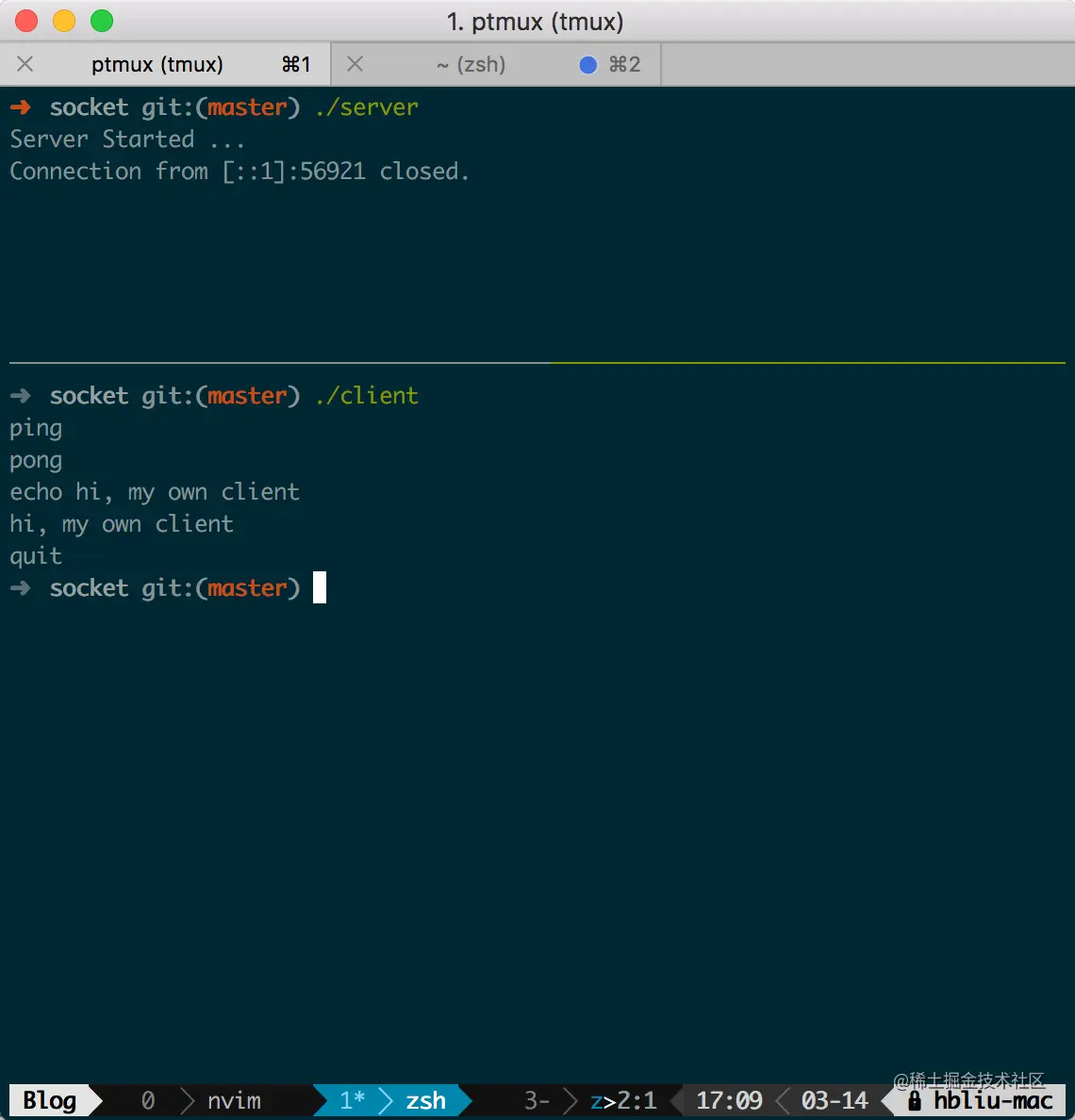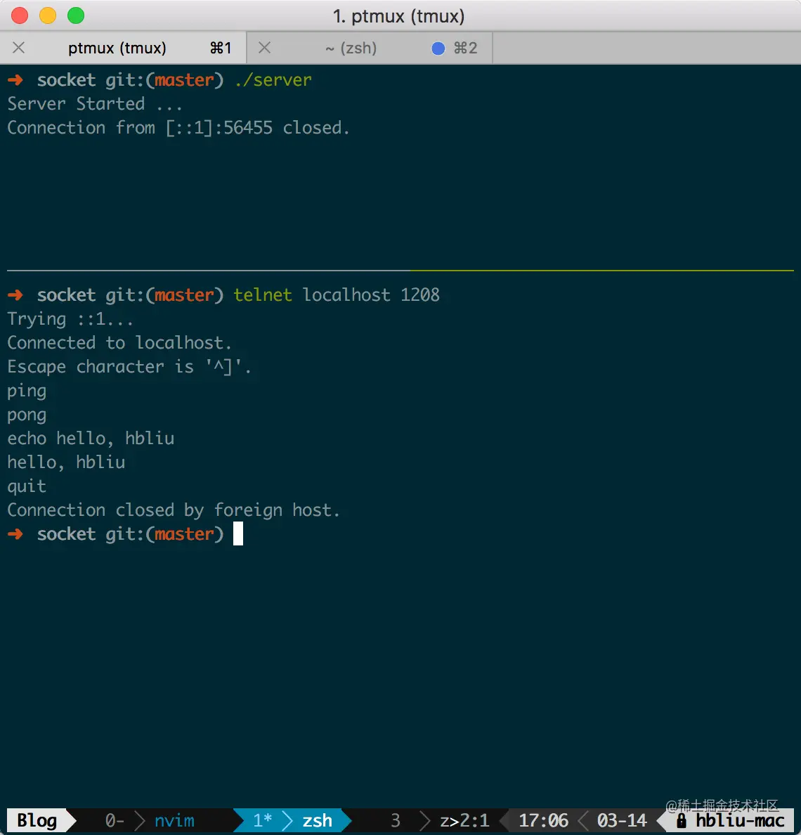 编译上面的服务端代码并启动后, 我们用 telnet 测试下服务端是否正常工作, 结果如下图所示: