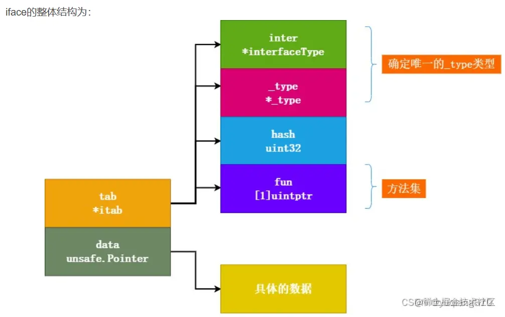 itab一部分是唯一确定包含该interface的具体结构类型,一部分是指向具体方法集的指针。